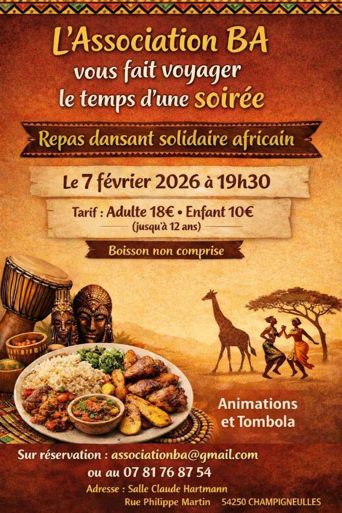 Soirée repas africain solidaire et dansant avec animations et tombola.