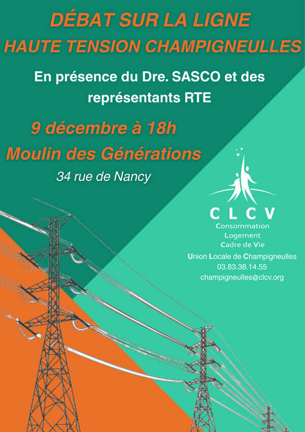 Soirée débat, le mardi 9 décembre à 18h, au Moulin des Générations (rue de Nancy à Champigneulles), avec la participation du Dre. SASCO (épidémiologiste pour la prévention du cancer, santé globale et éthique) et des représentants de R.T.E.Cette soirée concerne la ligne Haute Tension qui traverse différents quartiers situés rue Clairefontaine, Fontaine Saint-Joseph, et au-delà.