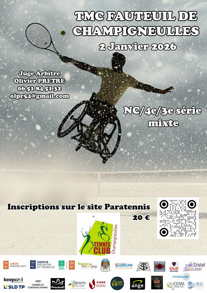 3ème édition de notreTournoi Multi Chance (TMC) de tennis fauteuil qui se déroulera sur la journée du 2 janvier.Manifestation mixte avec des classements nationaux qui commencent au n°60.