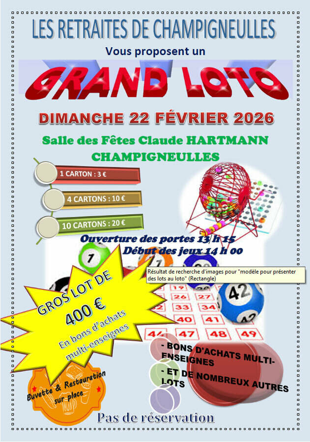 Loto doté de lots en cartes cadeau, places de spectacles, et lots divers. Gros lot de 400€ en carte cadeau. Pas de réservation.